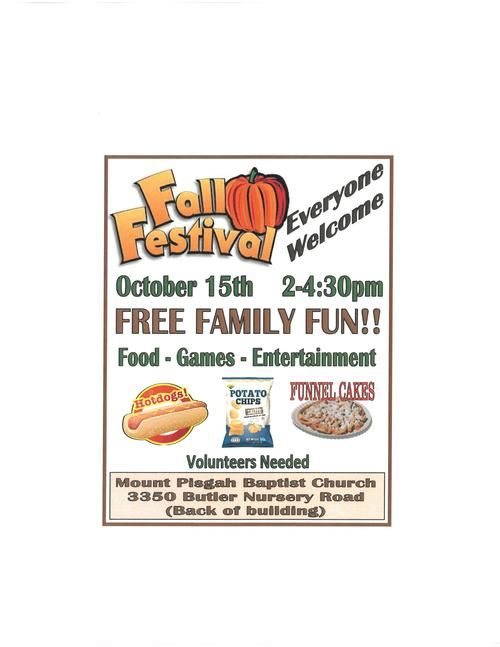 Our Community Fall Festival is an opportunity to welcome the families of Gray's Creek community to Mount Pisgah. Our goal is to provide a fun and free event for families. The event includes games, prizes, food, crafts, face painting and lots of other fun stuff. Hope to see you there!